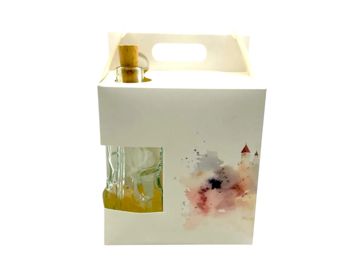 Cartonul din care este realizata cutia are o textura lucioasa si este imprimat cu grafica tematica, fiind rezistent la transport. Compartimentul pentru sticla este bine delimitat, asigurand stabilitate, iar zona pentru prajituri permite asezarea produselor in mod decorativ.