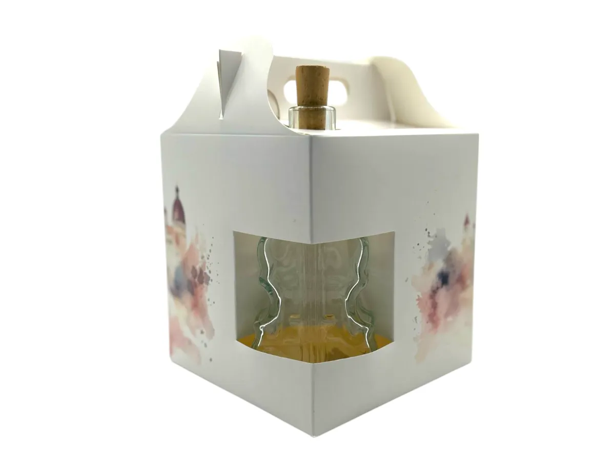 Fabricata din carton de calitate superioara, cutia este prevazuta cu compartimentare inteligenta – un spatiu bine delimitat pentru sticla de bautura, protejata de un perete despartitor solid, si o zona ampla dedicata prajiturilor artizanale. Dimensiunea generoasa de 25 x 17.5 x 17.5 cm o face potrivita pentru o gama larga de produse dulci sau lichide, pastrandu-le in conditii sigure si estetice pana in momentul oferirii.