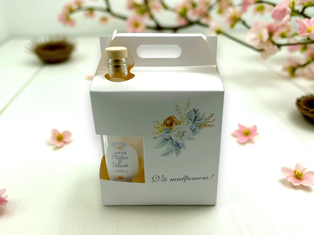 Cutie nunta pt prajituri si sticla M46 este realizata dintr-un carton rezistent, imprimat cu un model floral subtil, care adauga un plus de eleganta fiecarui cadou. Spatiul interior este bine impartit: o zona pentru o sticla mica de bautura (200–250 ml) si un compartiment alaturat pentru prajituri ambalate. Aceasta structura asigura stabilitate si protectie pentru continut.